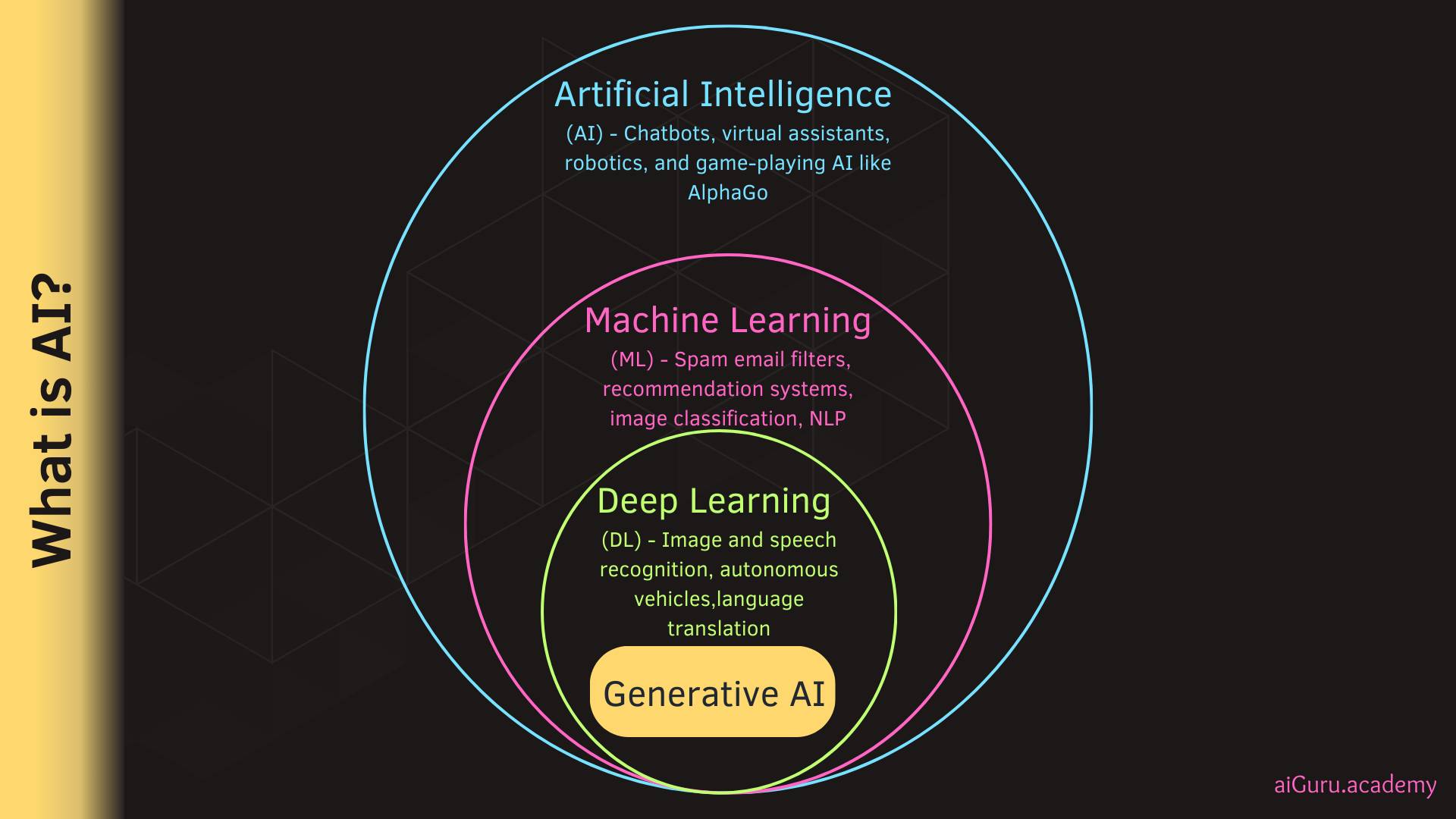 I am sure most of you know what AI is but to set the stage, here is the picture outlining AI, Machine Learning(ML), and Deep Learning(DL).